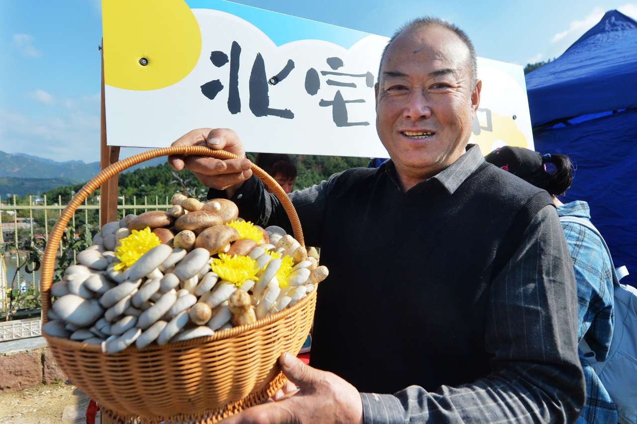 10月19日,村民在山东省青岛市崂山区北宅街道品金秋活动上展示丰产的平菇。