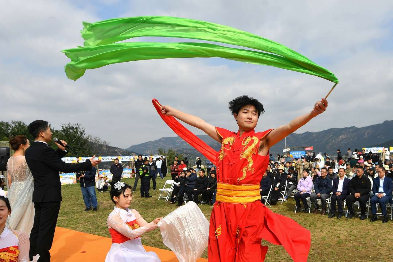 10月19日,村民在山东省青岛市崂山区北宅街道品金秋活动上歌舞庆丰收。