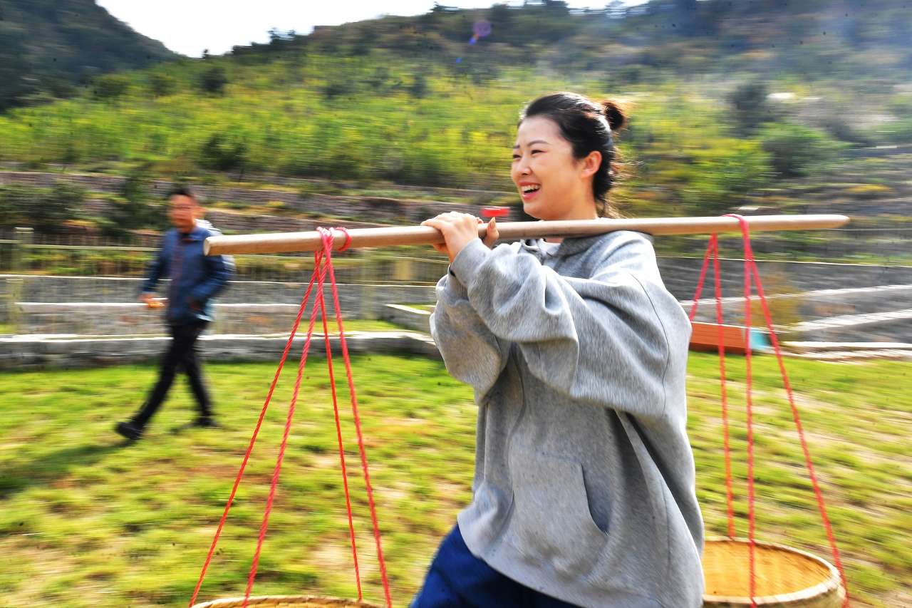 10月19日,游客在山东省青岛市崂山区北宅街道品金秋活动上参加“运粮夺丰收”游戏。