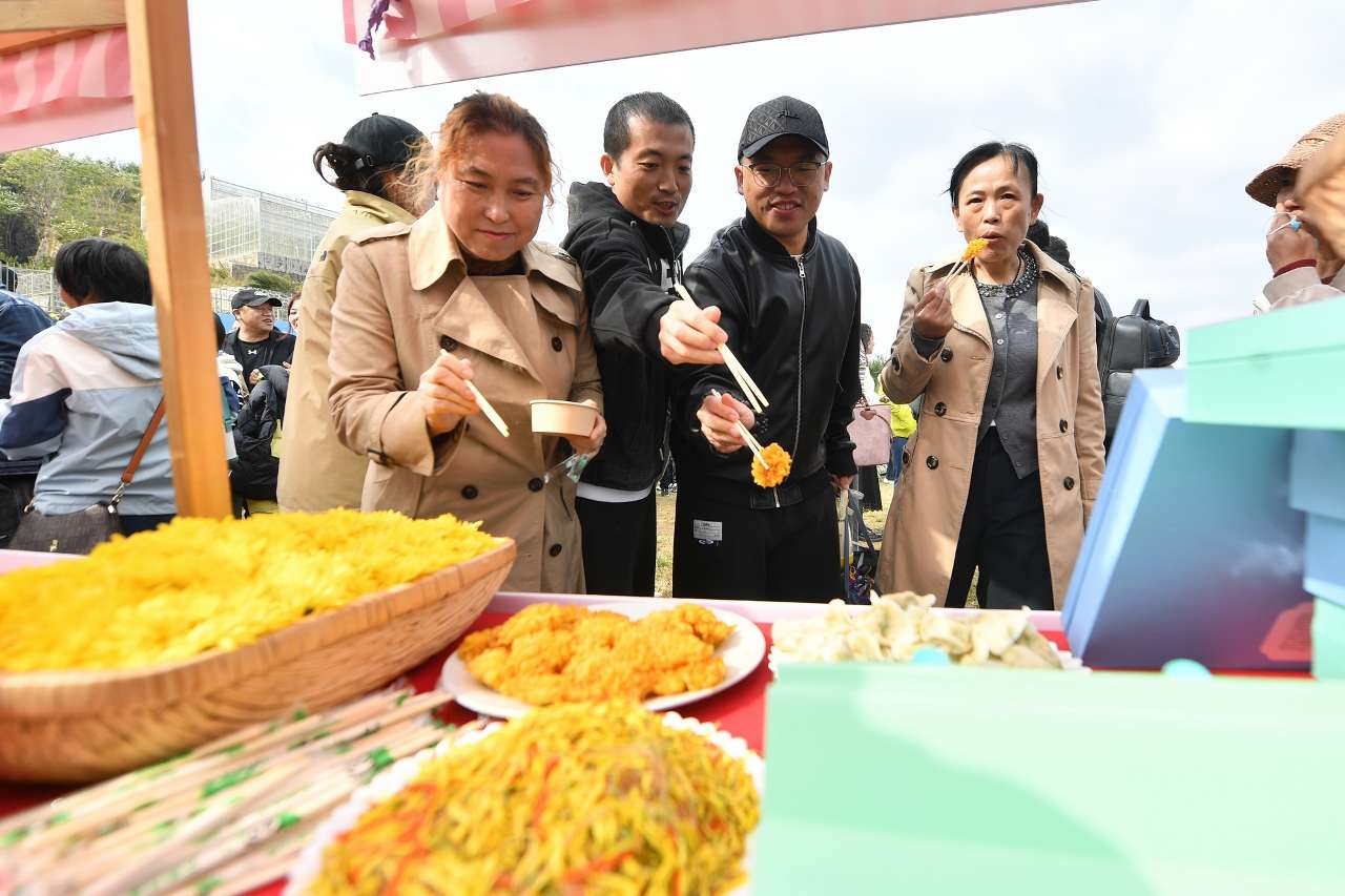 10月19日,村民在山东省青岛市崂山区北宅街道品金秋活动上品尝菊花制作的特色美食。