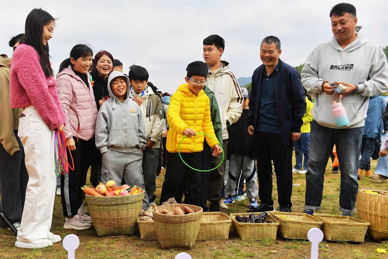 10月19日,小朋友在山东省青岛市崂山区北宅街道品金秋活动上做赢取农产品游戏。