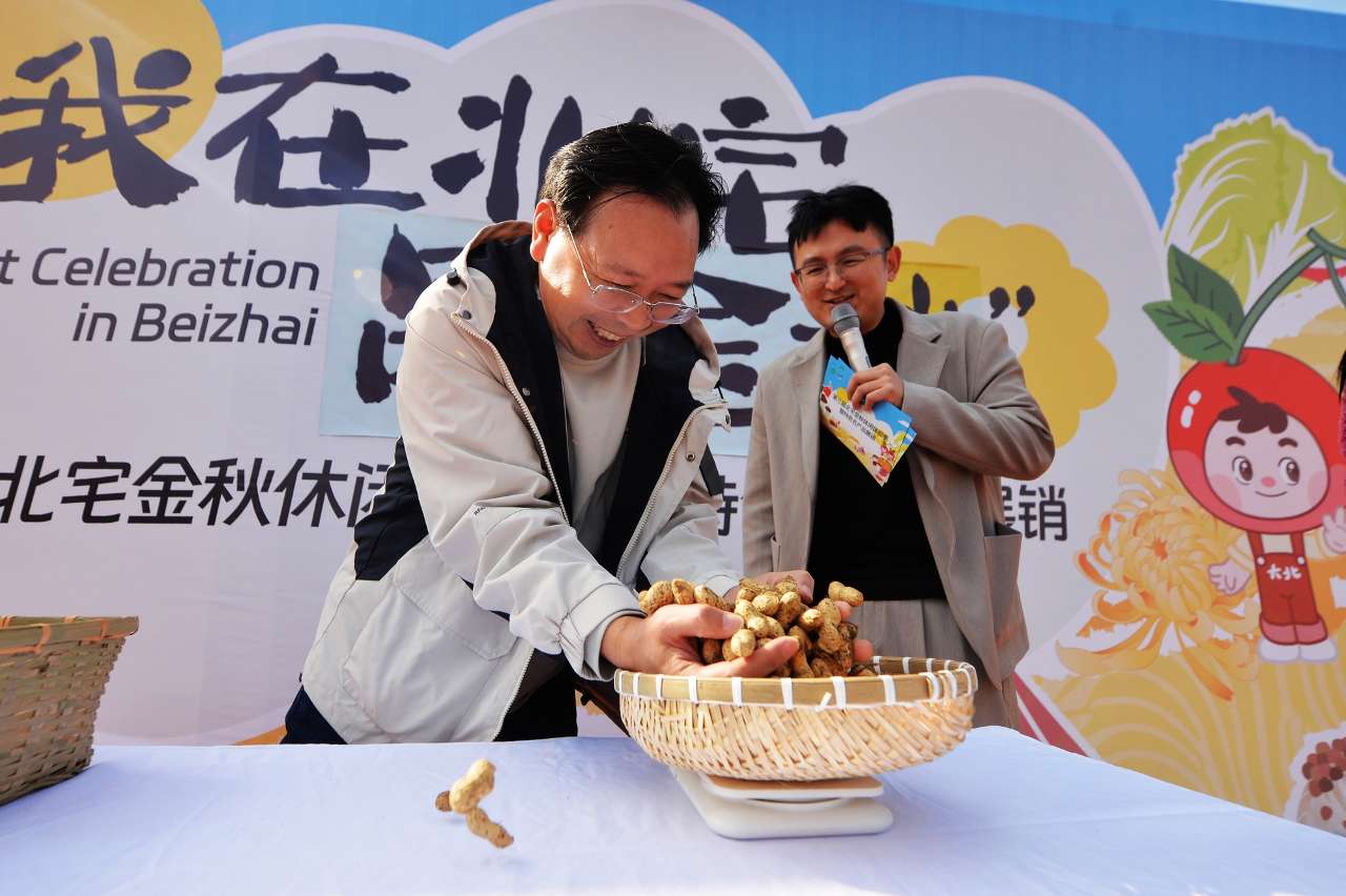 10月19日,村民在山东省青岛市崂山区北宅街道品金秋活动上参加花生争霸赛。