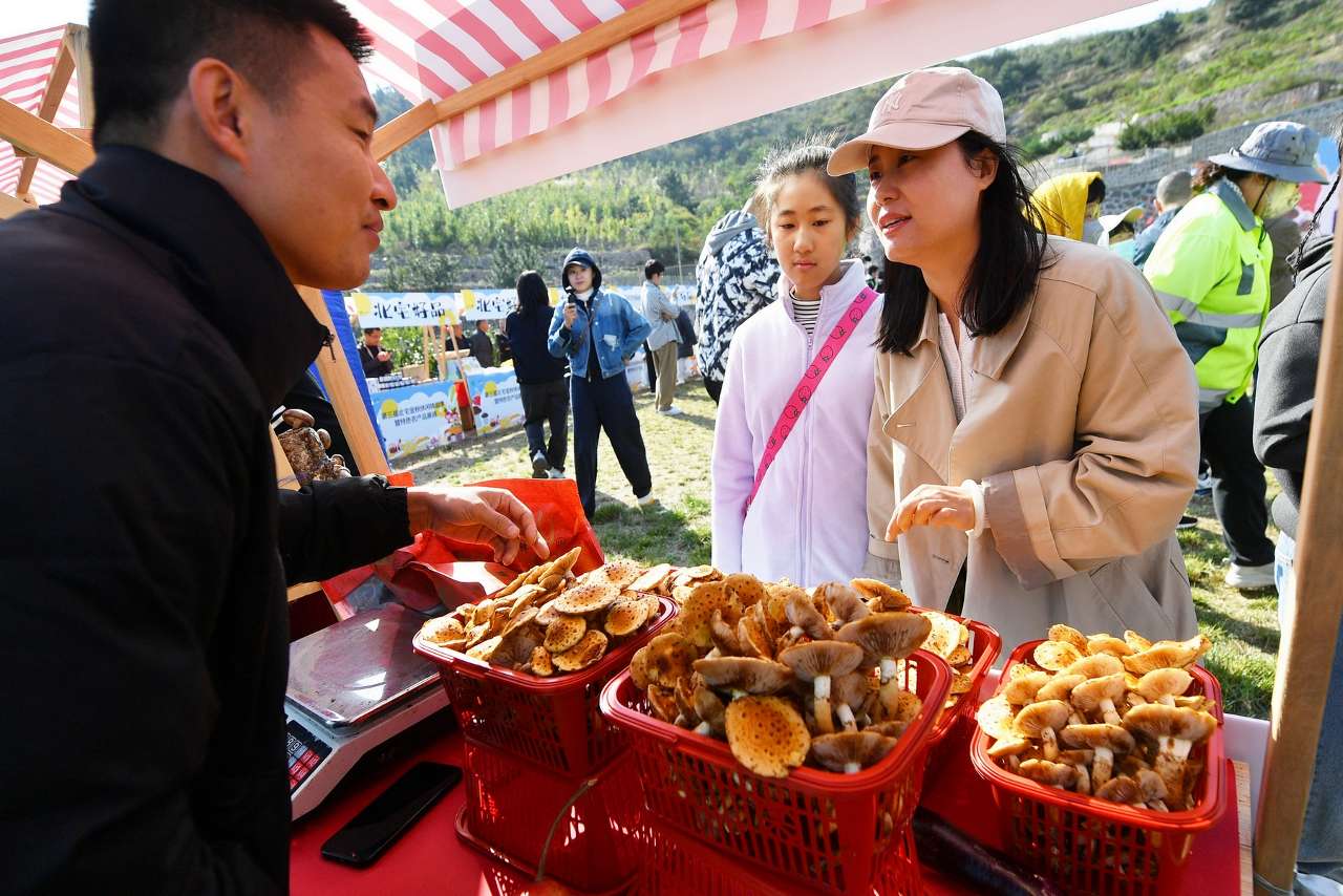 10月19日,游客在山东省青岛市崂山区北宅街道品金秋活动上选购柳树菇。